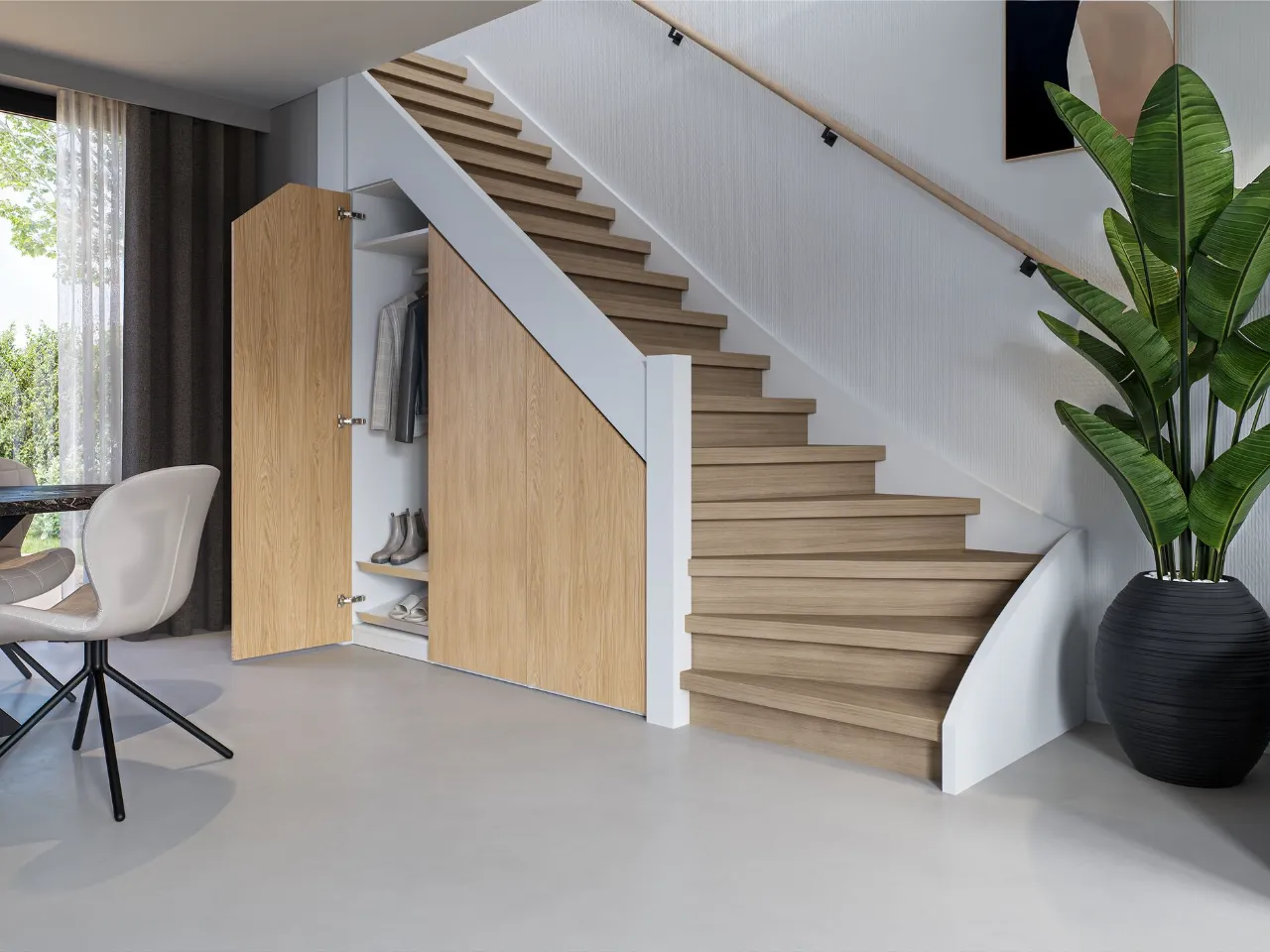 Weg met loze ruimte onder de trap! Met een trapkast op maat creëer je een slimme en stijlvolle opbergoplossing. Jij bepaalt de indeling – van garderobe tot voorraadkast – en wij maken het precies zoals jij het wilt. Kom langs in één van onze winkels en wij ontwerpen graag jouw trapkast op maat.